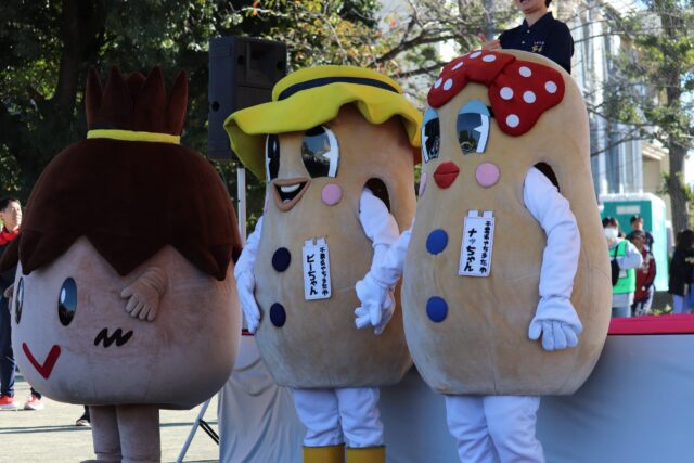 ピーちゃん、ナッちゃんのふたりは恋人同士。いつもいっしょにおでかけして八街市やピーナッツのPRをしています。