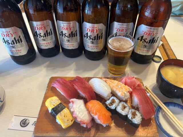写真を見てみて。ビールに囲まれた幸せそうなお寿司たち。